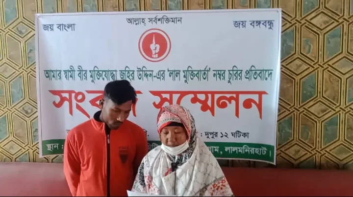 সংবাদ সম্মেলনে মুক্তিযোদ্ধার স্ত্রী ছামিনা খাতুন আরও বলেন, আমার স্বামী একজন প্রকৃত বীর মুক্তিযোদ্ধা। তিনি কালিগঞ্জ ভেরাবাড়ি এলাকায় থেকে ৬নং সেক্টরের অধীনে মুক্তিযুদ্ধে অংশগ্রহণ করেন। যুদ্ধ শেষে তিনি কর্মসংস্থানের জন্য পাটগ্রাম রসুলগঞ্জ এলাকায় দীর্ঘদিন ধরে বসবাস করেন। পরে আমার সাথে বিবাহবন্ধনে আবদ্ধ হন। যেকারণে আমরা দুজনেই ধবলসতী এলাকায় স্থায়ীভাবে বসবাস শুরু করি। তিনি রসুলগঞ্জে দীর্ঘদিন বসবাস করার কারণে লাল মুক্তিবার্তায় তার ঠিকানা রসুলগঞ্জ হয়ে যায়। সেই সুযোগকে কাজে লাগিয়ে নামের সাদৃশ্যের মিল থাকার কারণে আমার স্বামীর মুক্তিবার্তা নম্বর (০৩১৪০৩০৩৫৫) ব্যবহার করে ভিন্ন জহির উদ্দিনের সন্তানেরা নিয়মিত ভাতা উত্তোলন করছেন, যা আইনতভাবে অপরাধ ও প্রতারণার সামিল। আমি এটার স্থায়ী সমাধান চাই। আমার স্বামীর এমআইএস তালিকায় শুধুমাত্র বেসামরিক গেজেট নম্বর (১৪০৬) দিয়ে ভাতা অন্তর্ভুক্ত হয়। কিন্তু আমার স্বামীর ভারতীয় তালিকা নম্বর (৪৩৯৩৭) এবং লাল মুক্তিবার্তা নম্বর (০৩১৪০৩০৩৫৫) এর উল্লেখ না থাকায় অপর জহির উদ্দিনের সন্তানেরা আমার স্বামীর মুক্তিবার্তা নম্বর ব্যবহার করে দায়িত্বশীল ব্যক্তিদের ম্যানেজ করে সুকৌশলে ভাতা উত্তোলনসহ যাবতীয় সুযোগ সুবিধা ভোগ করছেন।