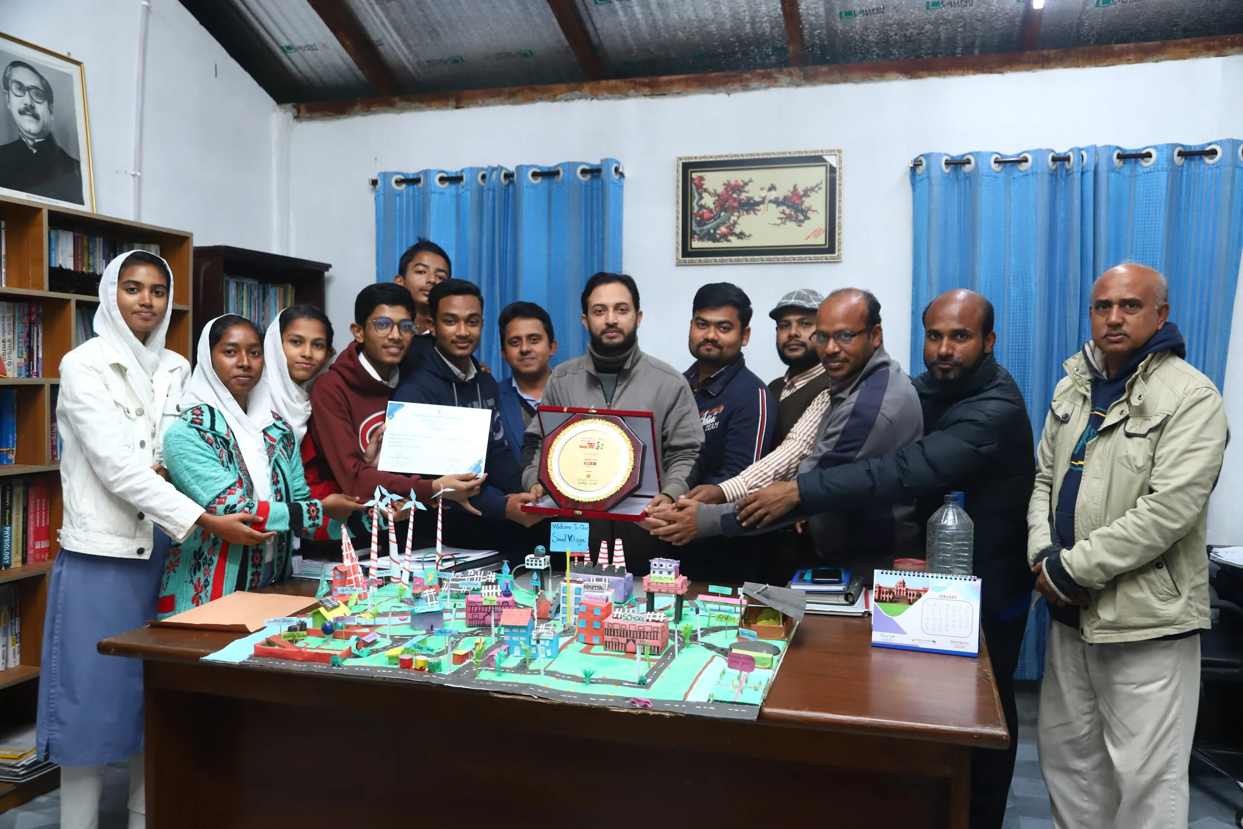 সার্বিক সহযোগিতায় ছিলেন বিদ্যালয়ের বিজ্ঞান বিভাগের শিক্ষক তুহিন মাহমুদ ও আমিনুল কবির। এই প্রকল্পে তারা এমন একটি বিজ্ঞানভিত্তিক স্মার্ট গ্রামের মডেল উপস্থাপন করেন যেখানে গ্রামে বসেই প্রতিটি নাগরিক সব ধরনের নাগরিক সুবিধা পেতে সক্ষম। শিক্ষা, স্বাস্থ্য, প্রযুক্তি, যোগাযোগ, বিনোদন, কর্মস্থান, বাজারব্যবস্থাপনা, কৃষি, বিশুদ্ধ প্রকৃতি নিয়ে কীভাবে একটি গ্রামকে আদর্শ গ্রাম হিসাবে গড়ে যায় এবং প্রতিটি ক্ষেত্রে কীভাবে বিজ্ঞান ও প্রযুক্তির ব্যবহার করে উন্নত জীবনযাপন নিশ্চিত করা যায় তা তুলে ধরে প্রকল্প উপস্থাপক তাওসিফ রহমান। তার উপস্থাপনায় মুগ্ধ হন উপজেলা নির্বাহী অফিসার, উপজেলা শিক্ষা অফিসার, উপজেলা কৃষি অফিসারসহ সকল দর্শনার্থীরা।