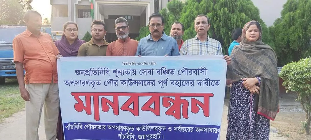 অন্তবর্তীকালীন সরকারের প্রজ্ঞাপনে সারাদেশের পৌরসভার মেয়র ও কাউন্সিলরদের অপসারণ করা হয় এবং তাদের স্থানে প্রশাসক নিয়োগ দেওয়া হয়। এই পরিস্থিতিতে জনপ্রতিনিধি শূন্যতায় পৌর এলাকার সাধারণ জনগণ নাগরিক সেবা পেতে ভোগান্তির শিকার হচ্ছেন। এ কারণে অপসারিত পৌর কাউন্সিলরদের পুনঃবহালের দাবিতে জয়পুরহাটের পাঁচবিবি পৌরসভা কার্যালয়ের সামনে বিকেলে পৌর কাউন্সিলর ও সেবা গ্রহীতারা মানববন্ধন করেছেন।