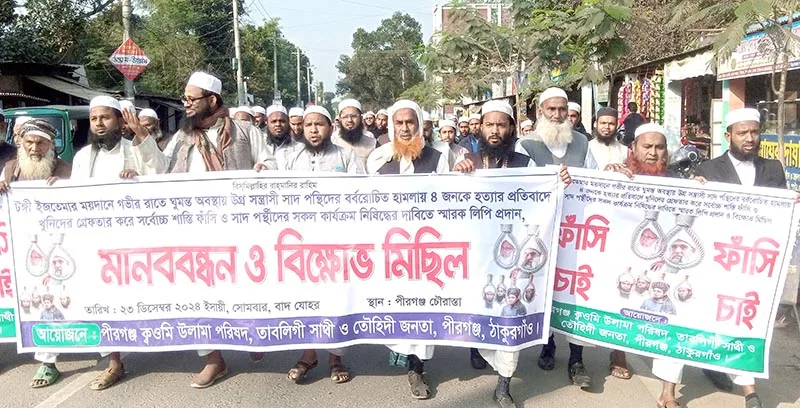 টঙ্গী ইজতেমা ময়দানে সন্ত্রাসী সাদপন্থীদের হামলায় ৪ জন নিহত ও সহস্রাধিক আহত এবং নিখোঁজ হওয়ার ঘটনায় প্রতিবাদ ও বিচারের দাবিতে ঠাকুরগাঁওয়ের পীরগঞ্জে মানববন্ধন কর্মসূচি পালন করা হয়েছে।