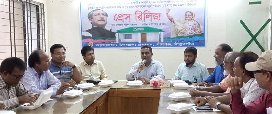 মুজিব বর্ষ উপলক্ষে প্রধানমন্ত্রী কর্তৃক আগামী ০৯ আগষ্ট আশ্রায়ন প্রকল্পের ক শ্রেণির ভুমিহীন ও গৃহহীন পরিবারকে জমি ও গৃহ প্রদান কার্যক্রমে ৪র্থ পর্যায়ের ২য় ধাপ এর উদ্বোধন উপলক্ষে ঠাকুরগাওয়ের পীরগঞ্জ উপজেলা প্রশাসনের আয়োজনে প্রেস রিলিজ অনুষ্ঠিত হয়েছে। সোমবার বিকেলে উপজেলা পরিষদ সভা কক্ষে আয়োজিত অনুষ্ঠানে প্রেস রিলিজের মাধ্যমে সাংবাদিকদের নিয়ে উন্মুক্তভাবে মতবিনিময় সভার আয়োজন করা হয়। আয়োজিত সভায় উপজেলা নির্বাহী অফিসার শাহরিয়ার নজিরের সভাপতিত্ত্বে বক্তব্য রাখেন উপজেলা সহকারী কমিশনার (ভুমি) মোঃ আব্দুল্লাহ আল-রিফাত, দৈনিক ইত্তেফাক সংবাদদাতা মেহের এলাহী ও সাংবাদিক সংগঠনের সভাপতি সম্পাদক প্রমূখ। উক্ত প্রেস রিলিজ অনুষ্ঠিত সভায় পীরগঞ্জ প্রেসক্লাব, উপজেলা প্রেসক্লাব, পীরগঞ্জ রিপোর্টাস ক্লাব, পৌর প্রেসক্লাব, থানা প্রেসক্লাব, প্রেসক্লাব পীরগঞ্জ এর অর্ধ শতাধিক সাংবাদিকগণ উপস্থিত ছিলেন। আয়োজিত বক্তব্যে জানানো হয় এ উপজেলায় ১ম পর্যায় থেকে ৪র্থ ধাপ পর্যন্ত ১৮৫৬ টি গৃহ নির্মাণ কাজ সম্পাদন করা হয়েছে। আগামিতে জমি আছে ঘর নেই এই প্রকল্পে কাজ শুরু হবে।