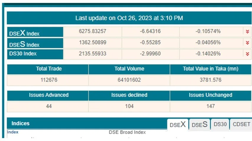 এদিন ডিএসইতে ৪৪টি কোম্পানির শেয়ারের দাম বৃদ্ধির বিপরীতে কমেছে ১০৪টি কোম্পানির শেয়ারের দাম। অপরিবর্তিত রয়েছে ১৪৭টি কোম্পানির শেয়ারের দাম। ডিএসইর প্রধান সূচক ডিএসইএক্স আগের দিনের চেয়ে ৬ দশমিক ৬৪ পয়েন্ট কমে ৬ হাজার ২৭৫ পয়েন্টে দাঁড়িয়েছে। প্রধান সূচকের পাশাপাশি অন্য দুই সূচকের মধ্যে ডিএসইএস শরীয়াহ সূচক দশমিক ৫৫ পয়েন্ট কমে দাঁড়িয়েছে ১ হাজার ৩৬২ পয়েন্টে। ডিএস-৩০ সূচক ২ দশমিক ৯৯ পয়েন্ট বেড়ে দাঁড়িয়েছে ২ হাজার ১৩৫ পয়েন্টে।