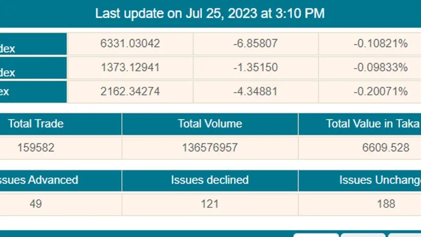 এদিন দাম বেড়েছে ৪৯টি কোম্পানির শেয়ারের, বিপরীতে কমেছে ১২১টির, আর অপরিবর্তিত রয়েছে ১৮৮টির। ডিএসইর প্রধান সূচক ডিএসইএক্স আগের দিনের চেয়ে ৬ দশমিক ৮৫ পয়েন্ট কমে দাঁড়িয়েছে ৬ হাজার ৩৩১ পয়েন্টে। ডিএসইর অন্য দুই সূচকের মধ্যে ডিএসই শরীয়াহ সূচক ১ দশমিক ৩৫ পয়েন্ট কমে দাঁড়িয়েছে ১ হাজার ৩৭৩ পয়েন্টে। ডিএস-৩০ সূচক ৪ দশমিক ৩৪ পয়েন্ট কমে দাঁড়িয়েছে ২ হাজার ১৬২ পয়েন্টে।