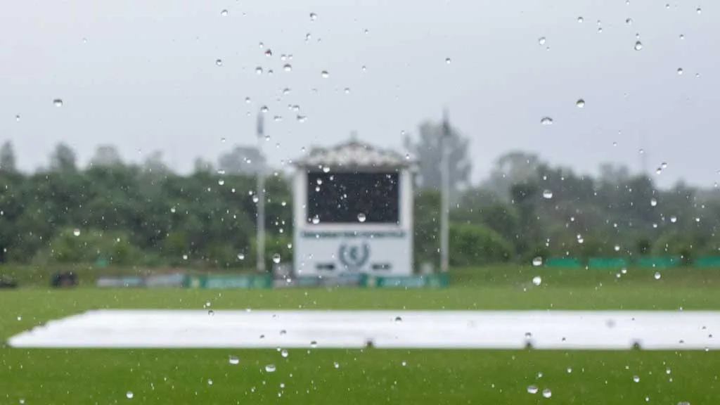 টানা বৃষ্টি ও ভেজা আউটফিল্ডে প্রথম সেশনে খেলা সম্ভব নয়। আপাতত বৃষ্টির মাত্রা কিছুটা কমলেও উইকেট ও এর আশপাশের কভার এখনও বহাল তবিয়তে রয়েছে। সীমানার কাছে বিভিন্ন জায়গায় জমে থাকা পানি দেখা যাচ্ছে।