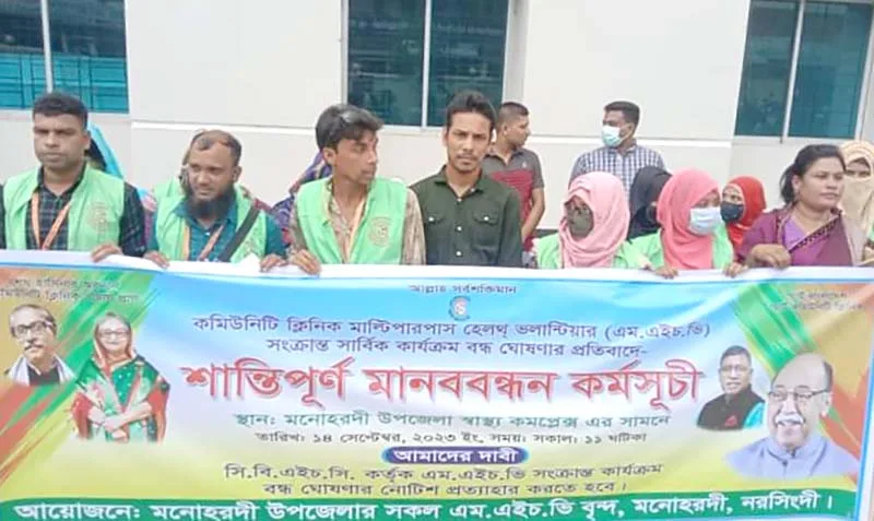 বক্তরা তাদের বক্তব্যে বলেন, কমিউনিটি বেইজড হেলথ কেয়ার (সিবিএইচসি) অপারেশনাল প্লানের আওতায় সারাদেশে ১০৭টি উপজেলার কমিউনিটি ক্লিনিকে ২১ হাজার মাল্টিপারপাস হেলথ ভলান্টিয়ার (এমএইচভি) মাঠ পর্যায়ে কর্মরত কর্মী আছেন। তারা গ্রামের প্রত্যন্ত অঞ্চলের প্রান্তিক জনগোষ্ঠীর কাছে স্বাস্থ্যসেবা পৌঁছে দিতে গুরুত্বপূর্ণ ভুমিকা পালন করে আসছে। তাছাড়া উঠান বৈঠকের মাধ্যমে স্বাস্থ্য শিক্ষা দিয়ে জনগণকে সচেতন করেন। যক্ষ্মা ও ইপিআই ক্যাম্প পরিচালনায় দায়িত্ব পালন করতে হয়, এমএইচভিদের। কিন্তু সিবিএইচসি কর্তৃক এমএইচভি সংক্রান্ত সার্বিক কার্যক্রম বন্ধ ঘোষণা করা হয়েছে। জানা যায় সাস্থ্য মন্ত্রণালয় থেকে পহেলা আগস্ট ডাঃ মোঃ কাইয়ুম তালুকদার লাইন ডাইরেক্টর, কমিউনিটি বেইজড হেলথ কেয়ার ও কমিউনিটি ক্লিনিক স্বাস্থ্য সহায়তা ট্রাস্ট সাক্ষরীত একটি বিজ্ঞপ্তিতে আদেশ জারি করেন।