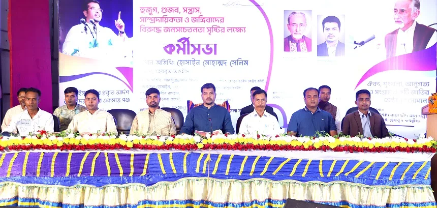 গতকাল যশোর জেলা পরিষদ মিলনায়তনে জেলা হেযবুত তওহীদের উদ্যোগে আয়োজিত এক কর্মীসভায় তিনি এ আহ্বান জানান। যশোর জেলা হেযবুত তওহীদের সভাপতি মোহাম্মদ জহির রায়হানের সভাপতিত্বে কর্মীসভায় প্রধান অতিথি হিসেবে বক্তব্য রাখেন হেযবুত তওহীদের এমাম হোসাইন মোহাম্মদ সেলিম। এদিন সকাল ১০টায় পবিত্র কোর’আন তেলাওয়াতের মধ্য দিয়ে আনুষ্ঠানিকভাবে সমাবেশ শুরু হয়। এসময় হাজারো কর্মী সমর্থকের উপস্থিতিতে জেলা পরিষদ মিলনায়তন কানায় কানায় পূর্ণ হয়ে যায়।