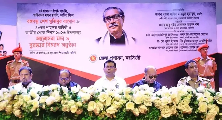 সর্বকালের সর্বশ্রেষ্ঠ বাঙালি, (১৫ আগস্ট) স্বাধীনতার মহান স্থপতি, মুক্তির মহানায়ক, জাতির পিতা বঙ্গবন্ধু শেখ মুজিবুর রহমান, এর ৪৮তম শাহাদাত বার্ষিকী ও জাতীয় শোক দিবস-২০২৩ইং উপলক্ষ্যে নরসিংদী জেলা শিশু একাডেমি, আলোচনা সভা ও পুরস্কার বিতরণ অনুষ্ঠিত হয়েছে।