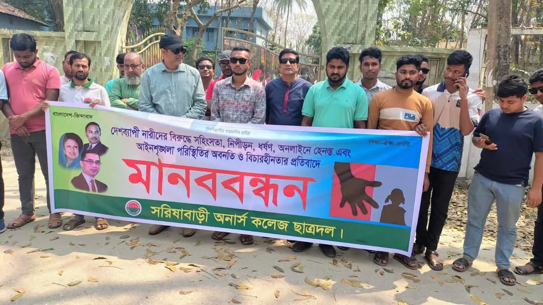 সারা দেশের ন্যায় জামালপুরের সরিষাবাড়ীতে ধর্ষণ, নারীদের সহিংসতা, নিপীড়ন, অনলাইনে হেনস্তা এবং আইনশৃঙ্খলা পরিস্থিতির অবনতি ও বিচারহীনতার প্রতিবাদে মানববন্ধন অনুষ্ঠিত হয়েছে।