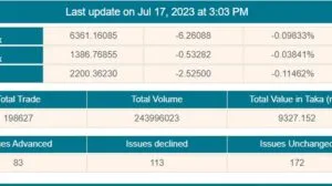 বিনিয়োগকারীদের বাজার মূলধন ফিরেছে আড়াই হাজার কোটি টাকা ডেস্ক রিপোর্ট:দু’দিন উত্থান আর তিনদিন পতনের মধ্যে দিয়ে জুলাই মাসের আরও একটি সপ্তাহ পার করেছে পুঁজিবাজার। আলোচিত সপ্তাহে… ২২ জুলাই ২০২৩